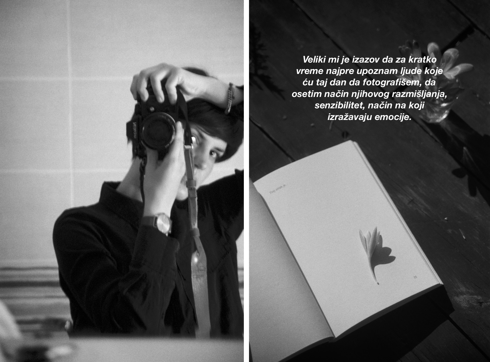 Fotografsko zanimanje specifično je po tome što zahteva veliku izloženost, kao i prisutnost u datom momentu. Okruženi ste različitim ljudima, morate da budete u kompleksnom stanju uma, intuitivni, kreativni, da umete da prodrete u psihologiju ljudi i da na širem planu shvatite date okolnosti. Zanimljivo je to da privatno nisam takva. Volim da budem okružena malim brojem ljudi, ne volim da se previše eksponiram, više mi leži da budem neko sa strane. Pored toga, morala sam da se upustim u nešto o čemu sam, zaista, makar teoretski, malo znala, pa sam bila prinuđena da se oslanjam na prirodni instinkt i „unutrašnji glas” kroz sam proces rada. Vreme je, naravno, učinilo svoje, pa sam se u navedenim segmentima dosta opustila. Iako se ponekad jave kočnice, uspevam da ih sa lakoćom prevladam. U tome su mi pomogle neke ličnosti koje ću kasnije imati čast i privilegiju da upoznam i koje će mi pružiti šansu da se upustim u nešto potpuno novo i drugačije.