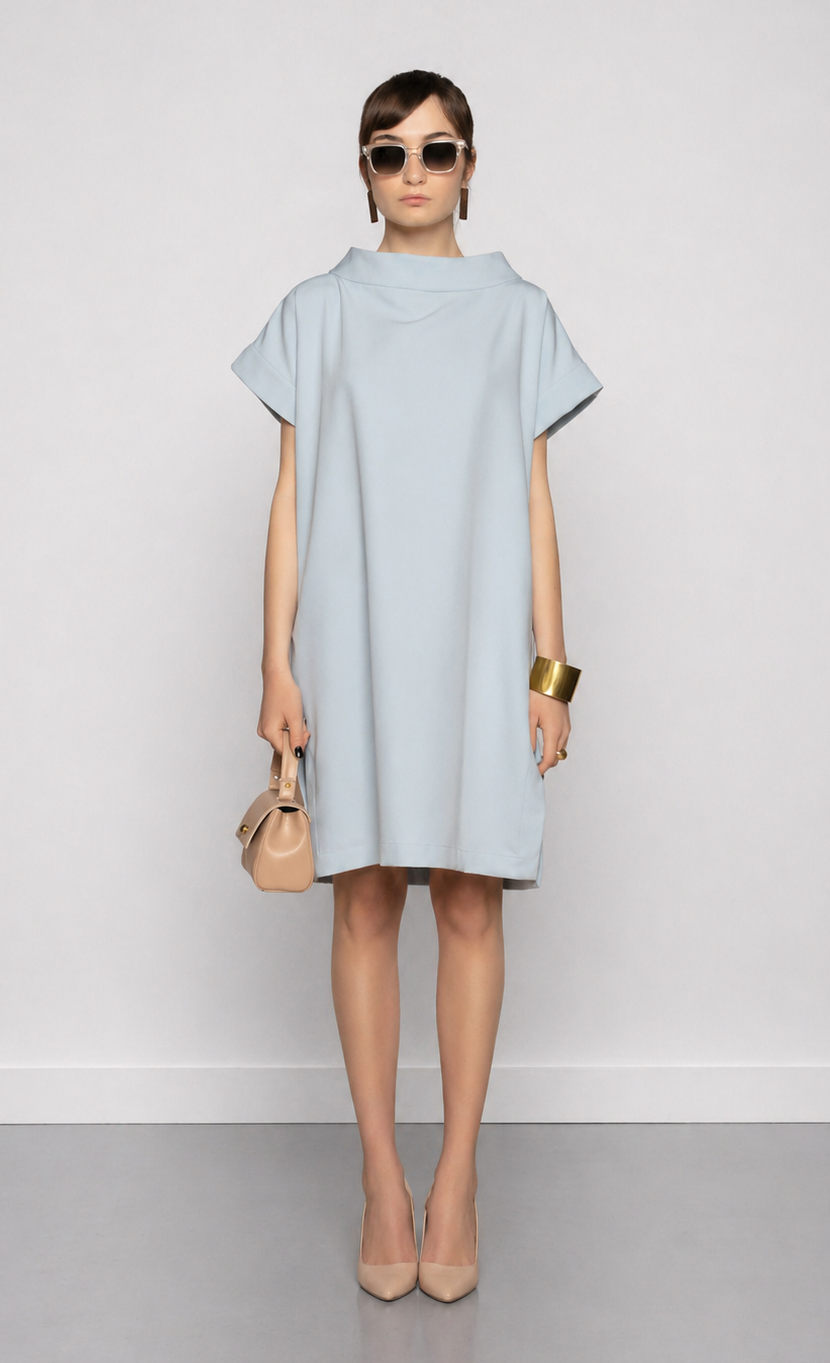 High collar boat neck dress with drop shoulders. Knee length, straight line with side round sleets and side pockets.