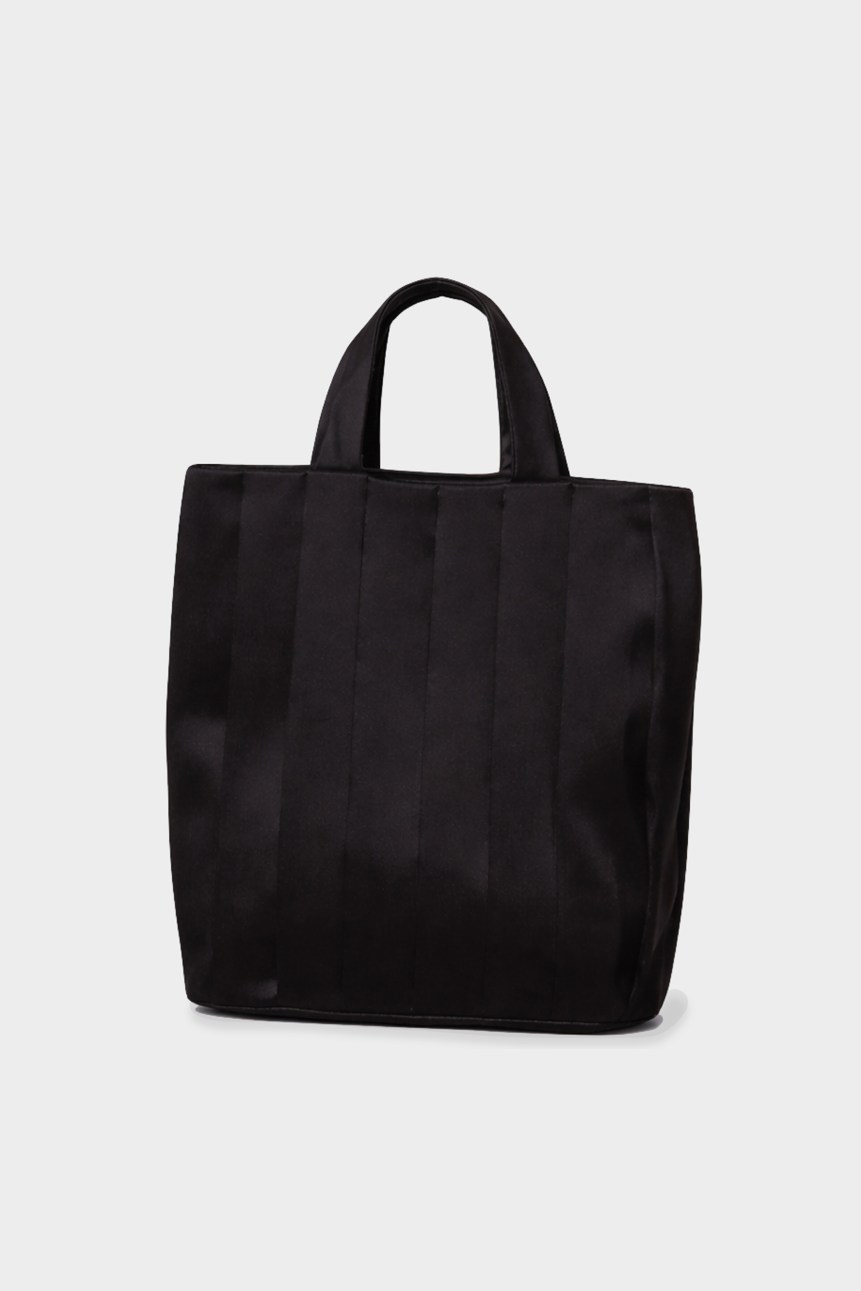 Medium black satin tote bag with with vertical pleats and short handle and zipper fastening.