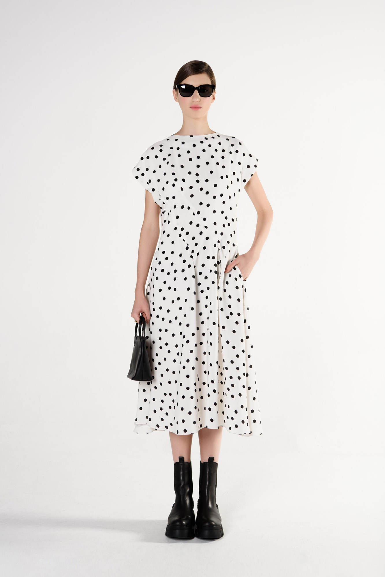 Boat neck line dress with dropped shoulders sleeves. Side pockets. Midi length.