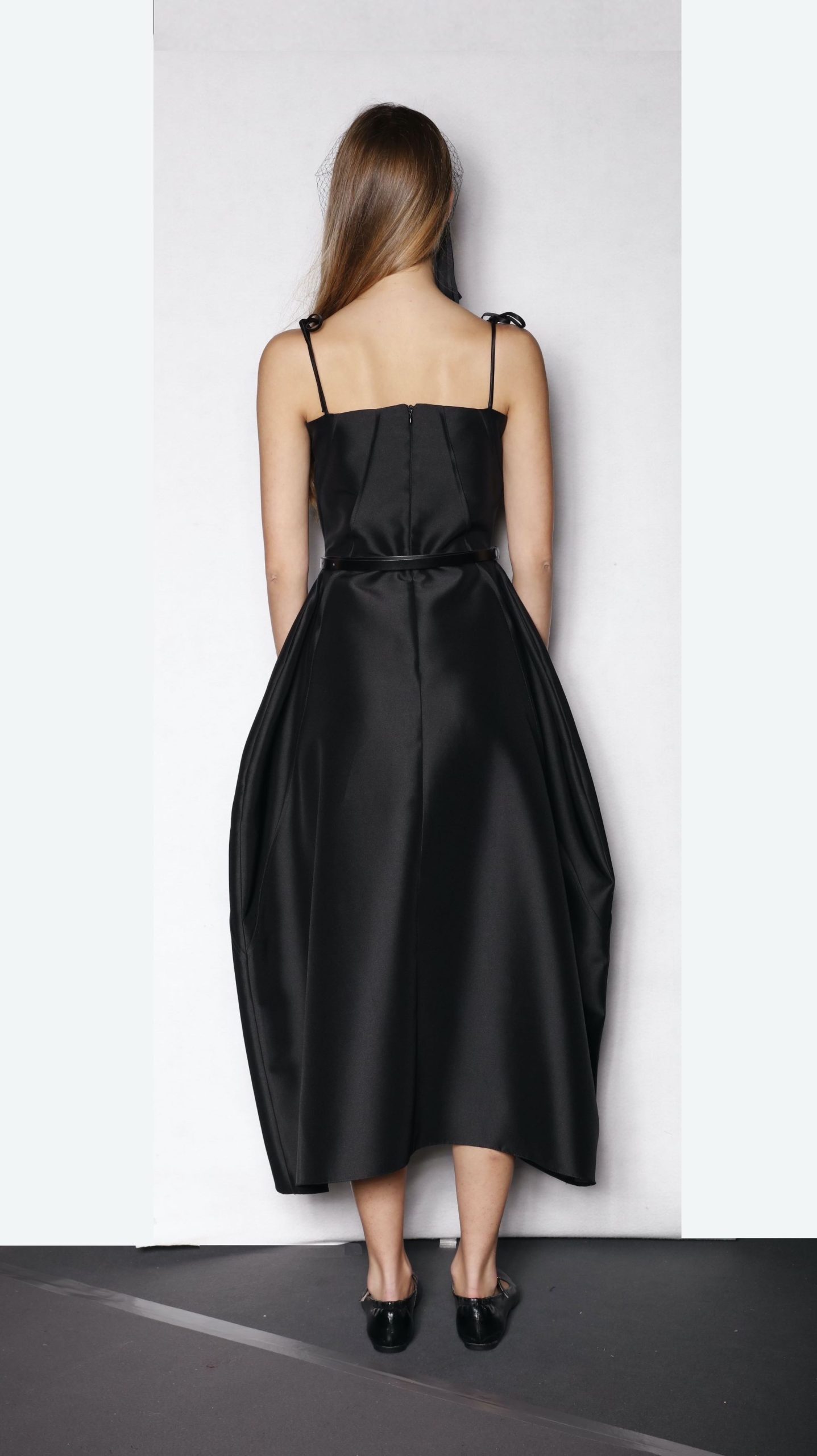 Rounded décolleté dress with spaghetti stripes and vertical seam details. Midi length with hips emphasized silhouette. Back zipper fastening.