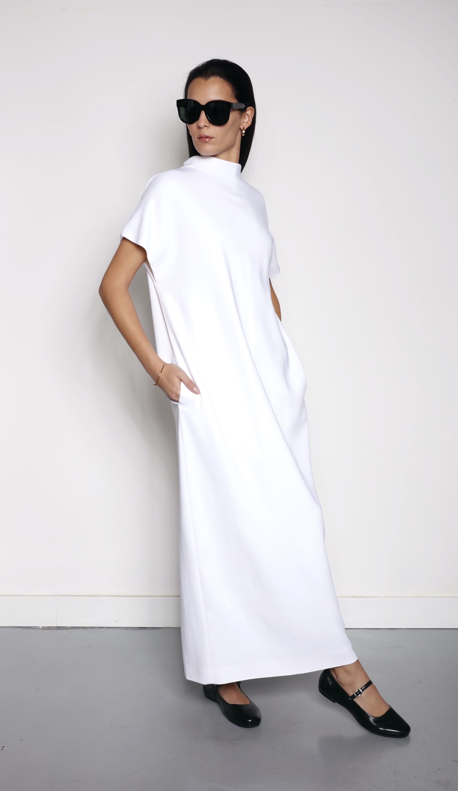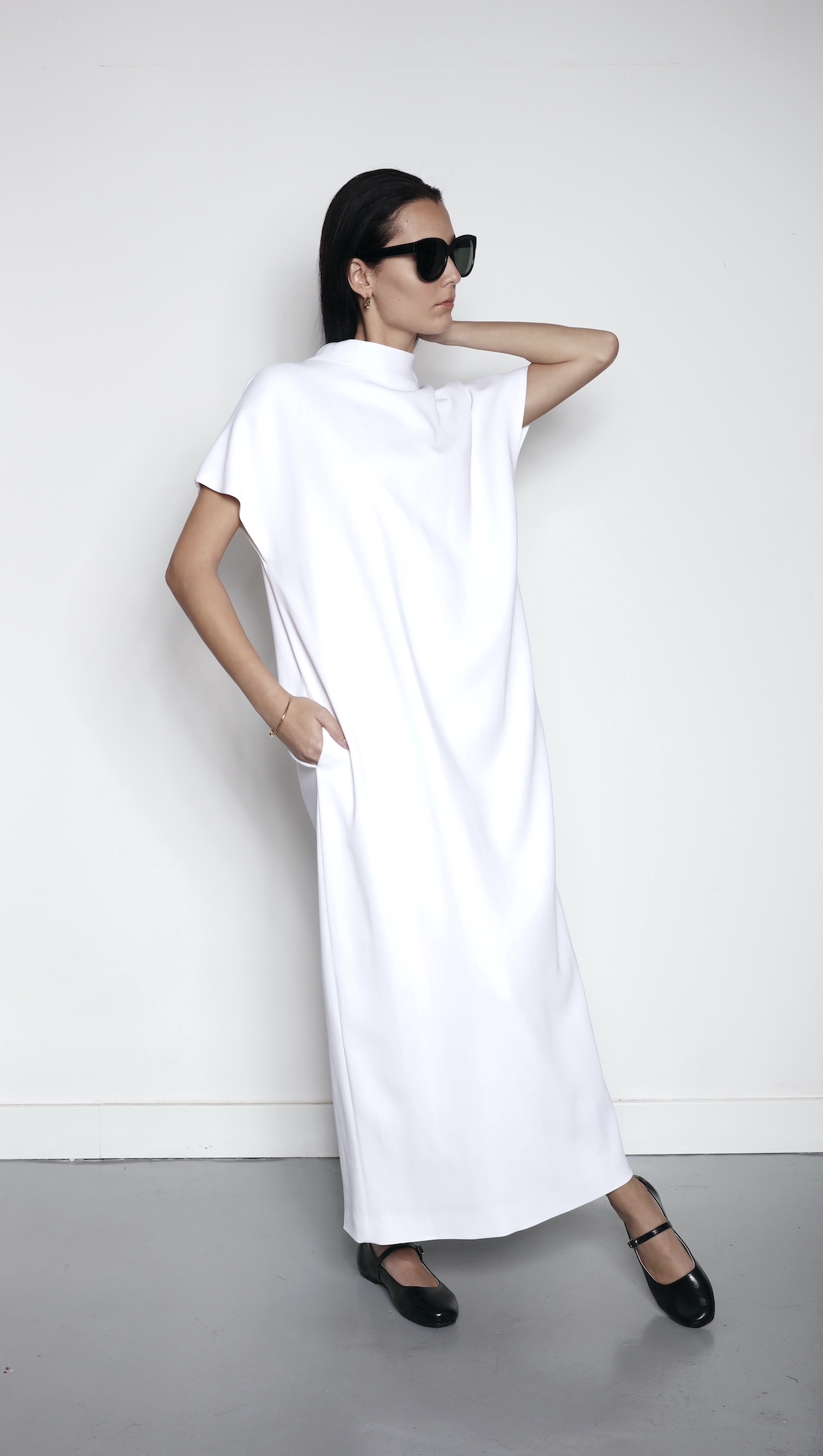 Turtle collar dress with short drop shoulders sleeves. Maxi length, straight line with one back sleet and side pockets.
